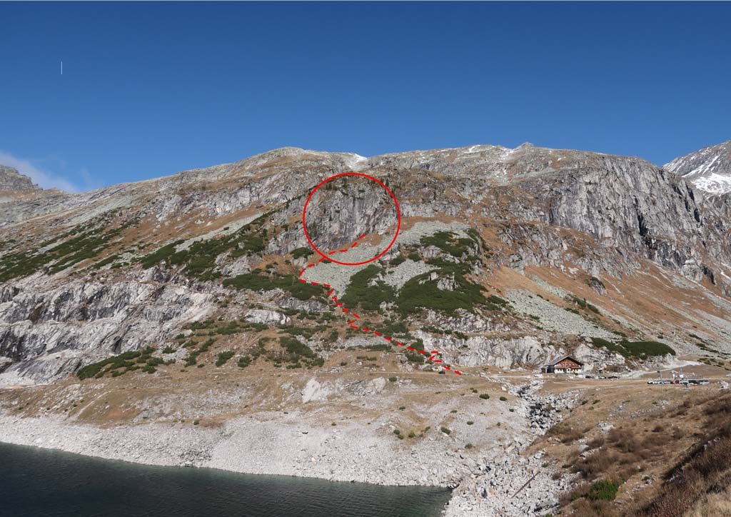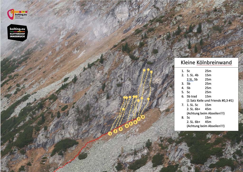 Direkt vor der Schranke geht beim Kölnbreinstüberl geht rachts ein Pfad bergaufwärts. Diesen ca. 2 Minuten bis zu einem alten, breiten Weg, dann links hinauf auf eine Ebene. Hier erkennt man einen kleinen Durchlass durch die Latschen, hinauf ins markante Schotterfeld. Dan dessen Rand immer linkhaltend hinaus bis zum BEginn der Wiese. Dann rechts über dem Geröll raus queren bis zu den Einstiegen.